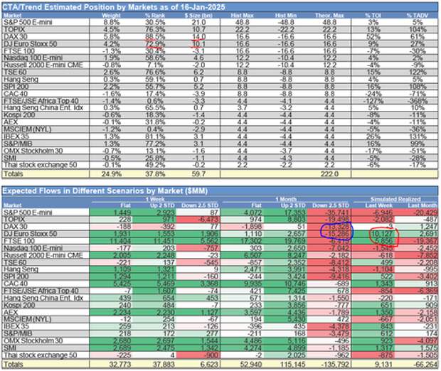 The recent rally (and surprising outperformance relative to the US YTD) in EU equities provides an opportunity to add some downside hedges, according to Goldman's Anton Tran. Any tariff announcements in the first few weeks of the new Trump administration have the potential to catch investors offside, particularly given the turn around in positioning. After reclaiming short/medium term thresholds in the last few weeks, the Goldman model suggest CTAs are now long EU delta with downside convexity in DAX and SX5E: