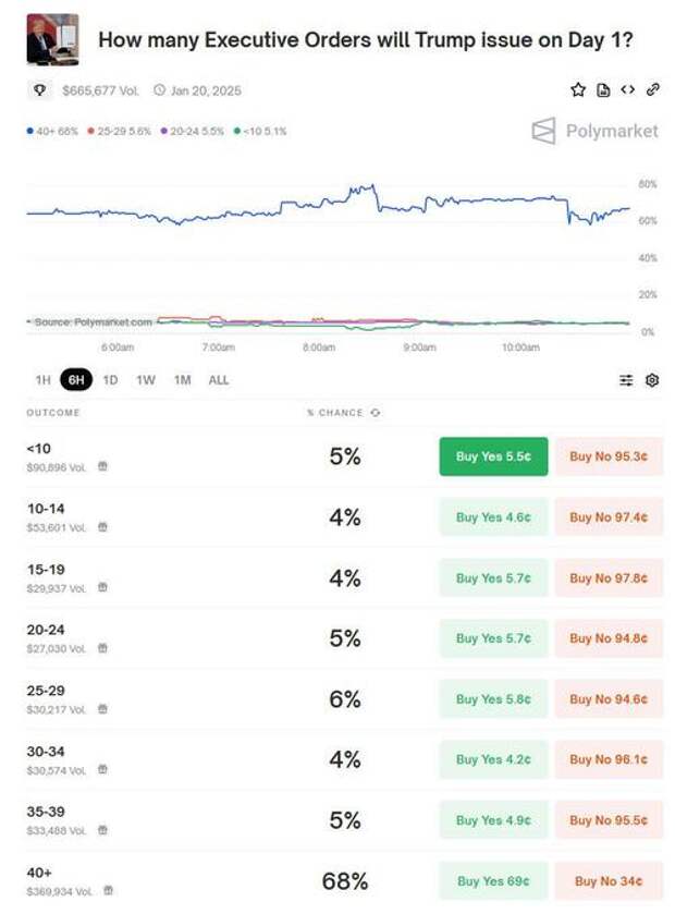 In 2017, Trump began using executive orders immediately upon taking office, reflecting his intent to fulfil key campaign promises (he issued 7 executive orders in his first week in 2017). There is an expectation (according to Polymarket) he could be even more aggressive this time around: