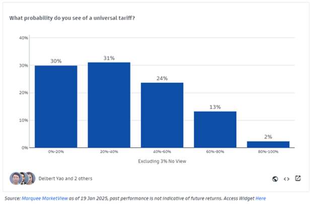 Polling of Goldman's clients is broadly inline with the above view, with investors assigning an average probability of 35% to a universal tariff: