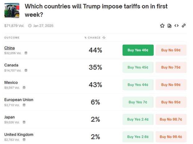 There is an expectation that some of these trade policies could enacted quickly. For example Polymarket puts a 44% probability of tariffs on China in the next week: