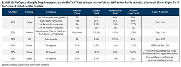 Goldman expects Trump to increase tariff rates on imports from China by average of 20% — less for consumer goods but by as much as 60% for non-consumer goods — and to impose some additional tariffs on auto imports. A universal 10-20% tariff on all imports is a serious risk—they assign a 40% probability—but is not their baseline.