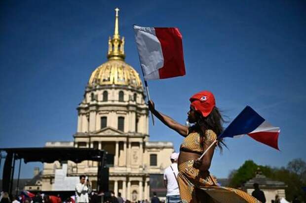 An attendee wearing a red Phrygian cap holds French national flags in front of the golden dome of Les Invalides, ahead of a rally in support of the president of Rassemblement National parliamentary group Marine Le Pen, in Paris on April 6, 2025. Julien de Rosa/AFP
