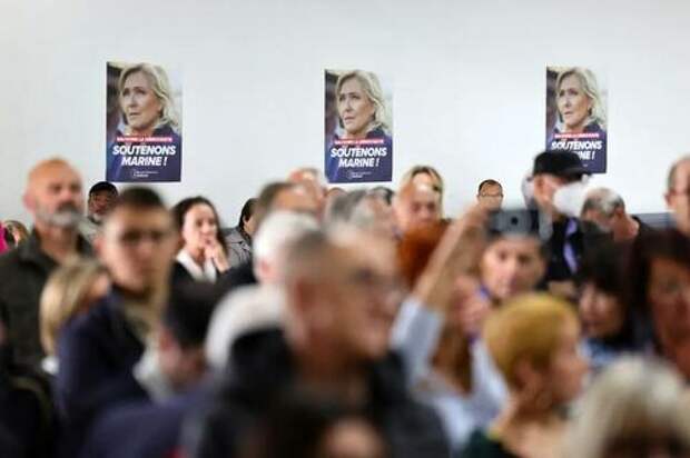 Participants stand in front of posters during a gathering in support of President of Rassemblement National parliamentary group Marine Le Pen, after she was convicted of a fake jobs scheme at the EU Parliament, in Marseille on April 5, 2025. Clement Mahoudeau/AFP via Getty Images