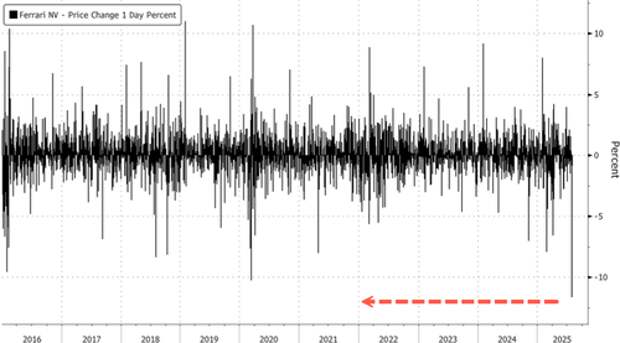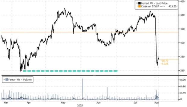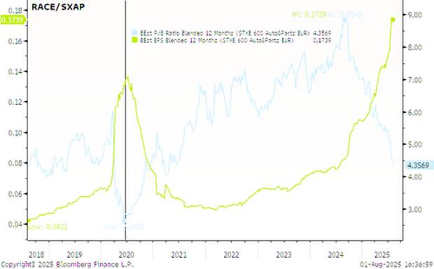 This is called a "sector relative de-rating"—Ferrari has underperformed the auto sector unusually sharply.