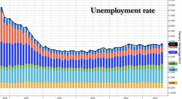 Going down the report, the unemployment rate rose from 4.1% to 4.2%, as expected, which may be the only silver lining in today's report as the Fed is now more focused on the unemp rate (according to Powell) than the number of jobs actually added.