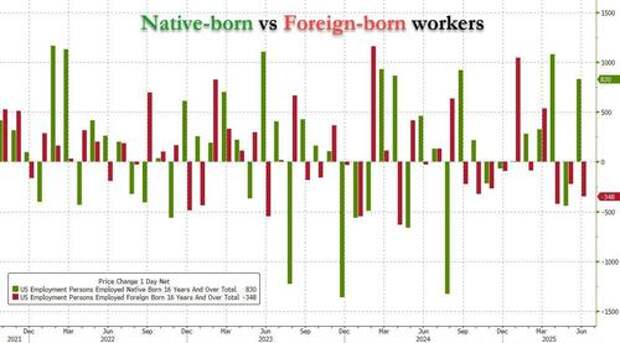 One very interesting twist is that the number of native-born workers actually jumped by 383K in July, following the 830K increase in June. Meanwhile, foreign-born workers tumbled for the 4th month in a row, plunging by 467K in July. As such one can argue that much of today's jobs report was a consequence of the purge of illegal aliens from the labor market.