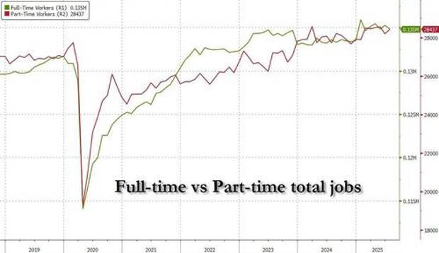There was more ugliness: looking beneath the surface we find that the number of full-time jobs tumbled 440K to 134.837 million, while part-time jobs surged by 237K to 28.437 million.
