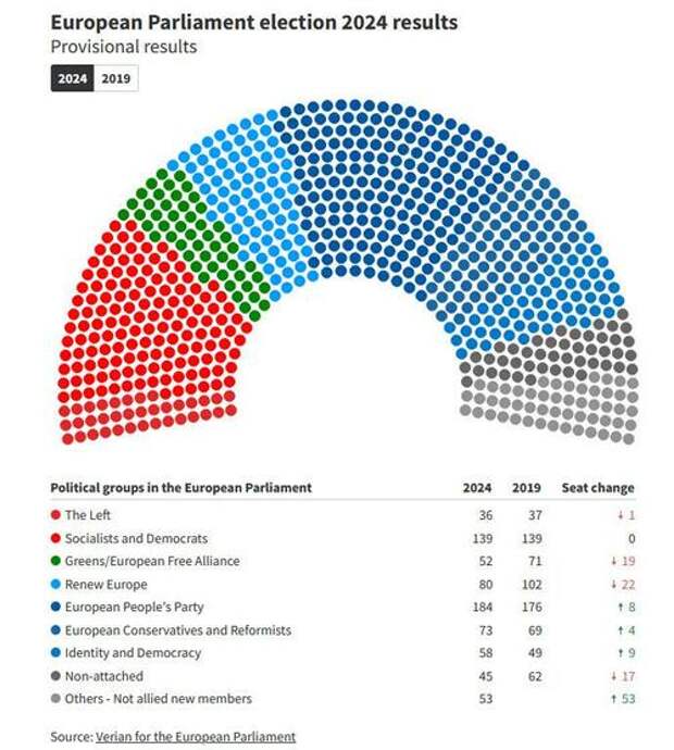 This totals 403 seats for the grand coalition, a decrease from their current 417 seats in the old 705-seat Parliament. The hard-right ECR alliance of Giorga Meloni’s Fratelli d’Italia and the Polish nationalists are projected to rank fourth, with 73 seats, while the far-right Identity & Democracy group is expected to gain 58 seats. The Greens suffered a significant loss, dropping to sixth place with 52 seats, with the Left following at 36 seats, a slight decrease. There are also 45 seats for non-attached members, and 53 newly elected members that are not allied to any of the political groups yet. The overall left-right balance aligns with projections that indicated a lean but not a lurch to the right.The coming weeks will see national parties formally choosing their European groups and this may alter the seat numbers. The battle for top positions commences at this week’s G7. The most coveted roles are the presidencies of the European Commission, European Council, European Parliament, and the EU Foreign Affairs Chief. The first EU summit of government leaders will be on June 27 and 28, where they will seek to nominate the new president of the European Commission. Nominations for the new European Commissioners will follow after the summer, with all nominees appearing at hearings in the European Parliament in the autumn.