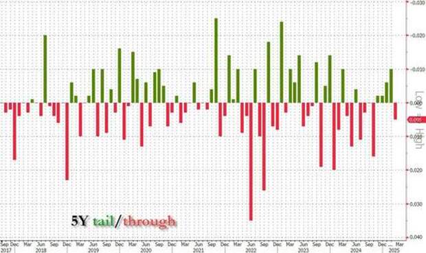 The auction stopped at a high yield of 4.100%, down from 4.123% last month and the lowest since September; however, it also tailed the When Issued 4.095% by 0.5bps, the first tailing 5Y auction since October.
