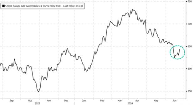 In markets, the news sent the Stoxx 600 autos and parts index up 2.2% in Frankfurt trading. Volvo Cars and German automakers traded up the most in terms of percentage, with the Swedish firm up 5.9% while Porsche AG gained 3.6%, Volkswagen +2.7%, BMW +3.5%, and Mercedes +2.5%. French car parts Forvia and Valeo were the only decliners.