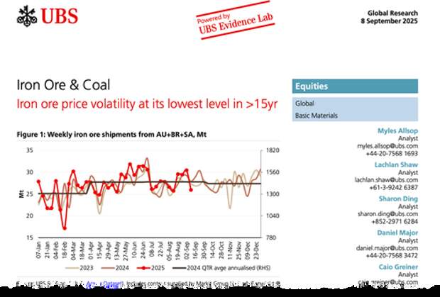 Iron ore prices have shuffled up to ~$105/t last week with activity rebounding after the military parade and on improving sentiment (due to the China Work Plan & Fed rate cut expectations). On the key signals we note: 1) Iron ore inventories at ports (Fig24) and at mills (Fig26) in China are broadly stable w/w; 2) Iron ore shipments from traditional markets (Fig2) continue to recover with Brazil +3% YTD (> Access Dataset); 3) Steel production in China accelerated in early-Aug in the CISA data (Fig10), though MySteel utilisation rate data remains broadly flat (Fig14); 4) Steel exports from China remain strong at ~106Mtpa in Aug despite increasing trade restrictions (Fig19) - Baosteel expects China steel exports to remain >100Mt in 2025, albeit softer in 4Q; 5) Positioning on the Dalian has turned incrementally more negative and is now at -2Mt of net contracts (Fig37). We have Neutral ratings on Vale, RIO & BHP, and Sell on FMG & KIO; we est. spot 2026 FCF yield of BHP at 4%, RIO at 8%, Vale at 15% (interactive model).