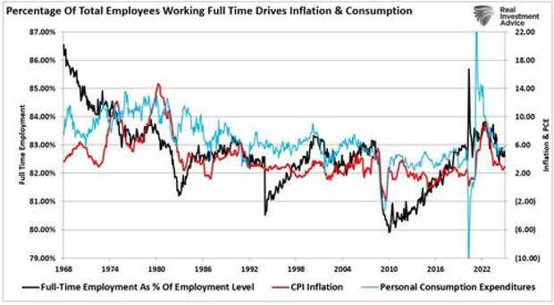 The data supports that last statement. Weaker full-time employment as a percentage of the current employment level correlates to weaker personal consumption expenditures. If the “demand” for goods and services declines, so does inflation.