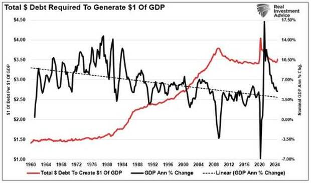 The production cycle is crucial to both economic and inflation expectations. Without a strong employment market, increasing organic economic activity is challenged. While increases in Government spending can temporarily offset weakness in consumption, the sustainability of that support is challenged as it requires increasing levels of debt to generate the same level of economic activity in the future, as shown above.