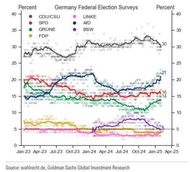 Germany is set to hold a federal election on February 23, 2025, following the collapse of Chancellor Olaf Scholz's three party coalition government in December last year. The conservative CDU/CSU is currently leading in the polls, with the populist, anti-immigrant, AfD - which has been endorsed by Elon Musk - in second place and rising, and which could spoil Wall Street's party expecting a boost to German fiscal stimulus, if it outperforms.