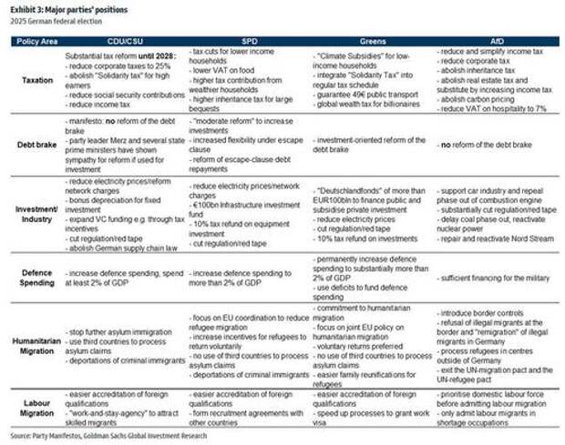 - As Goldman FICC strategist Jonathan Luey writes, the upcoming election is, in effect, a defacto referendum on fiscal reform given this was the reason the last government failed and the the proposals from the leading parties would challenge the debt brake in its current form.