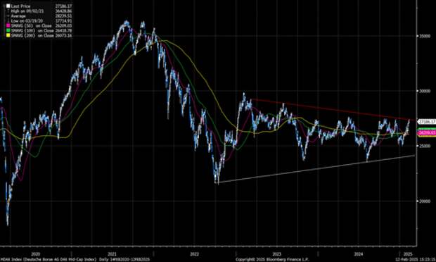 - From a technical standpoint, following the 2022 derating post the start of the Ukraine/Russia conflict, MDAX has consolidated in a tight range. It is now testing the upper bound: