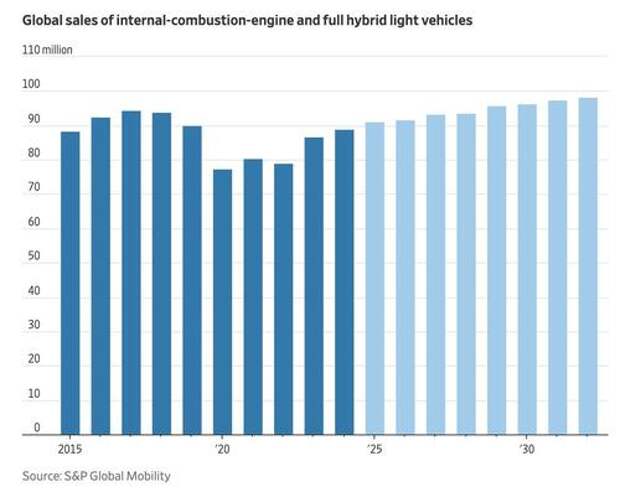 There is another path. Like U.S. oil companies that ignored renewables and doubled down on their most profitable business—with strong results—the Detroit automakers could lean into gasoline and hybrids. Hybrid demand is still growing and uses nearly the same supply chain as traditional vehicles. S&P Global Mobility expects global gasoline and hybrid sales to rise through at least 2032.