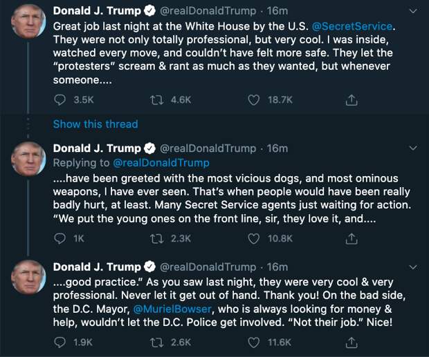 In response to Washington, D.C. protests on Friday evening, President Trump thanked the Secret Service on Saturday morning for protecting the White house.