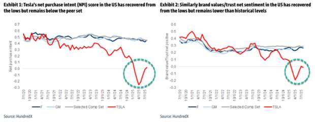 New consumer survey data from HundredX and Morning Consult, which tracks net purchase intent and net buzz around the vehicle brand, shows sentiment improving. Earlier this year, Democratic Party–aligned dark-money-funded NGOs waged an informational war against Tesla over Musk's involvement with DOGE, but with that propaganda campaign subsiding many months ago, consumers appear to be returning to the brand.