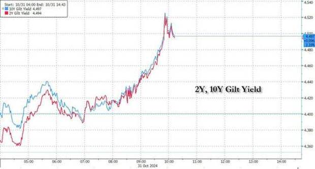 This morning we are getting confirmation that we may have been right once more, because both 2Y and 10Y Gilt yields are blowing out, and trading literally on top of each other as the entire gilt curve pancakes. The 10Y is trading at the highest level since Oct 2023, while the 2Y is back to May levels.