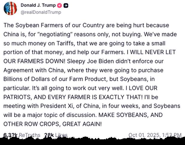 Trump noted in the Truth Social post above that he will be meeting with Chinese President Xi Jinping in four weeks and will make Soybeans a "major topic of discussion."