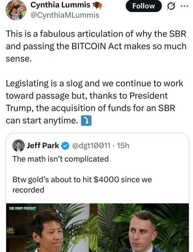 Lummis made the comments in response to a post from ProCap BTC chief investment officer Jeff Park, who shared a video of himself and Bitcoin bull Anthony Pompliano discussing the potential of the Strategic Bitcoin Reserve.