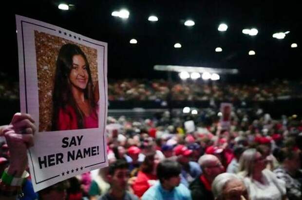 A supporter holds a sign with a photo of Laken Riley before Republican presidential candidate former President Donald Trump speaks at a campaign rally in Rome, Ga., on March 9, 2024. Mike Stewart/AP Photo