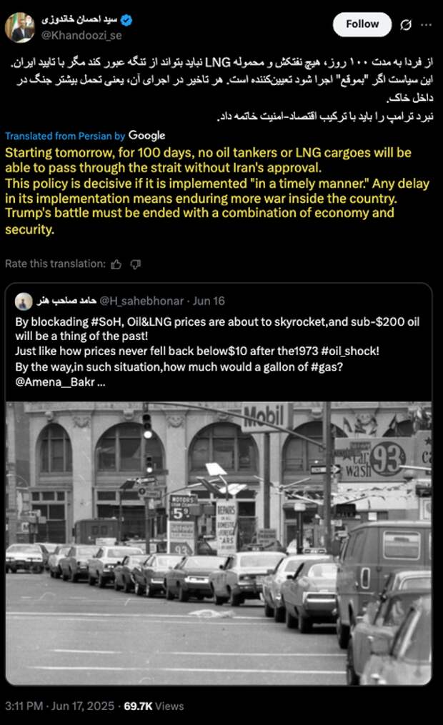 "Starting tomorrow, for 100 days, no oil tankers or LNG cargoes will be able to pass through the strait without Iran's approval," Khandouzi said.