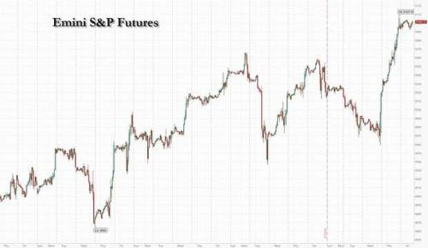 US equity futures were poised for a muted end to the week after Thursday's blowout rally which sent the S&P over 2.1% higher, its biggest one-day gain since Jan 2023, after Nvidia’s blowout earnings rekindled global euphoria about artificial intelligence (even as Google demonstrated just how racist and useless it actually is) and pushed the S&P to its highest close on record, while also sending European and Japanese markets to all time highs.
