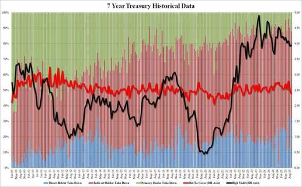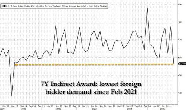 But it was the internals that were especially bad: Indirects, aka foreign buyers, plunged from 77.5% to 56.4%, the biggest monthly drop in 4 years. Worse, this was the lowest foreign demand since March 2021, when as veteran bond traders will recall, the US had a near-failed 7Y auction.