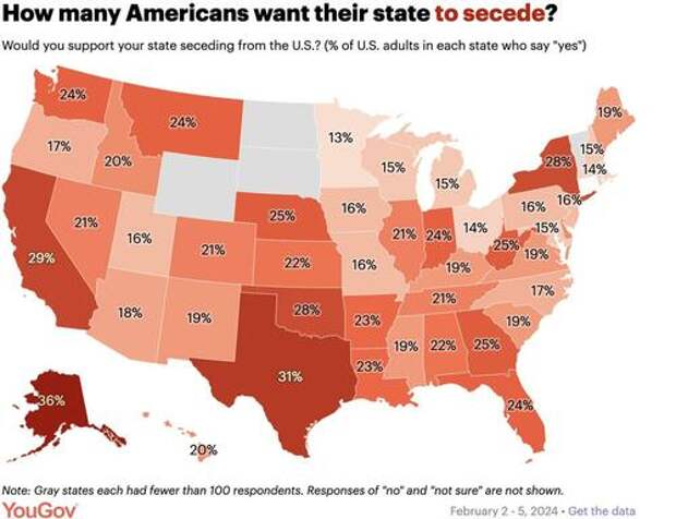 A YouGov poll taken earlier this year found substantial slices of both major parties would support their state’s departure from the union: 29% of Republicans and 21% of Democrats. Similarly, the five states in which secessionist yearning is highest represent a mixed bag of red and blue: Alaska (36%), Texas (31%), California (29%), New York (28%) and Oklahoma (28%). While 23% of all Americans want their state to secede, 28% would be content if other states did so.