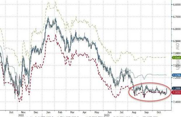 USD/CNY continues to bump up against the upper band of the yuan fix, signaling the pressure the currency is under.