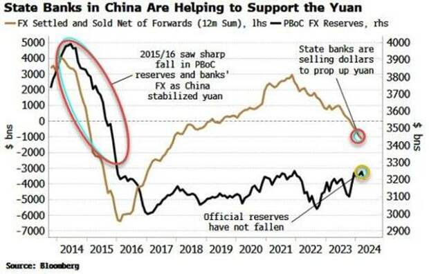 Foreign FX at banks is falling. Some of this likely due to capital outflow, but some is also due to China directing state banks to intervene to prevent the currency from weakening too far.