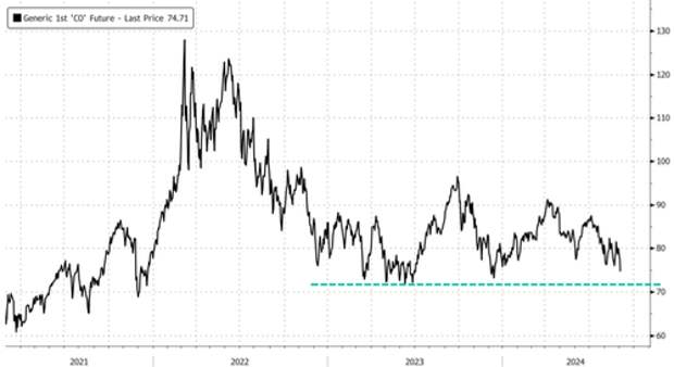 "Brent/WTI heavy down 2% … following through on weak China data, OPEC headlines last week .... despite Libyan export halt. Timely call this Thursday after GIR lowered Brent range to $70-85 last week," Goldman's Ryan Novak told clients this AM.