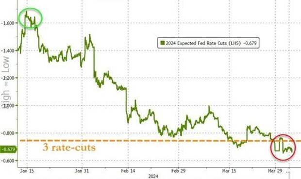 Fed Chair Powell is likely to hammer home the message that rate-cuts are coming but not just yet in a keynote address at Stanford University this afternoon. His remarks follow an endless parade of his peers also jawboning market expectations down (successfully) to the point where the market is now more hawkish than The Fed's latest dots.