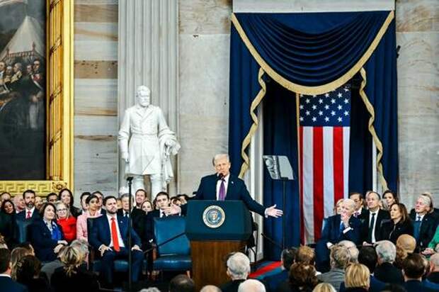President Donald Trump speaks after taking the oath of office in the U.S. Capitol Rotunda on Jan. 20, 2025. Kenny Holston-Pool/Getty Images