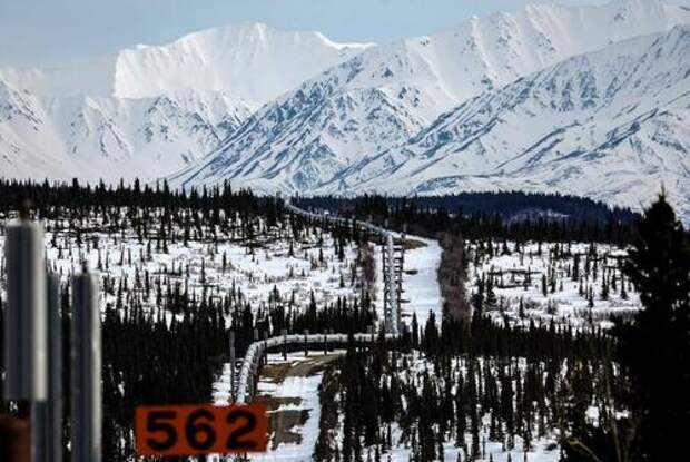 A part of the Trans Alaska Pipeline System runs through boreal forest past Alaska Range mountains near Delta Junction, Alaska, on May 5, 2023. The 800-mile-long pipeline carries oil from the North Slope in Prudhoe Bay to the port of Valdez. Mario Tama/Getty Images