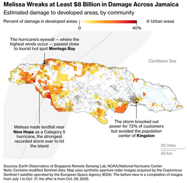 Hurricane Melissa was the most powerful storm to make landfall in Jamaica in over 170 years, ripping through the Caribbean island's western region with 185 mph winds and leaving widespread destruction to infrastructure, towns, resorts, and farmland. The storm's central pressure is likely to have fallen below the threshold that would trigger a $150 million catastrophe bond designed to offset weather-related losses through the capital markets.