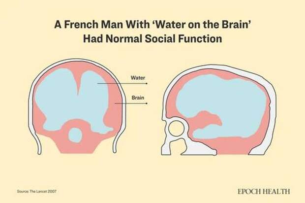 When he was 44 years old, he went to the doctor due to a mild weakness in his left leg. The doctors scanned his head thoroughly and discovered that his brain tissue was almost entirely gone. Most of the space in his skull was filled with fluid, with only a thin sheet of brain tissue.