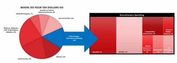 The data below shows that of every dollar spent by the Federal Government, roughly 73% is “mandatory” spending on social welfare and interest expense.