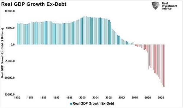 Another way to view this is to consider “debt-free” economic growth. In other words, without debt, there has been no organic economic growth since 2015. Thus, the debt and subsequent deficits must continue to expand to sustain economic growth.