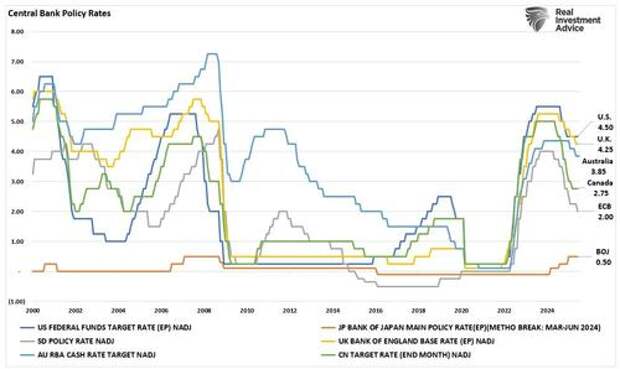 The mechanics of this are straightforward. When global capital flows into dollars, it often flows directly into U.S. Treasuries. Treasury securities remain the world’s deepest and most liquid sovereign debt market. As discussed in that same article, global Central Banks are cutting rates at one of the fastest paces on record. To wit: