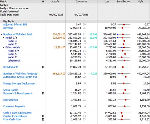 Vehicle sales for Q1 fell 13% year-over-year to 336,681. Growth is expected to stagnate this year, with consensus forecasting a modest 3% increase in deliveries, though some analysts now expect fewer sales than in 2024.