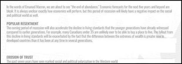 "Economic forecasts for the next five years and beyond are bleak," reads the RCMP assessment of the rest of the decade, adding a quote from France's Macron which reads "the end of abundance" is nigh.