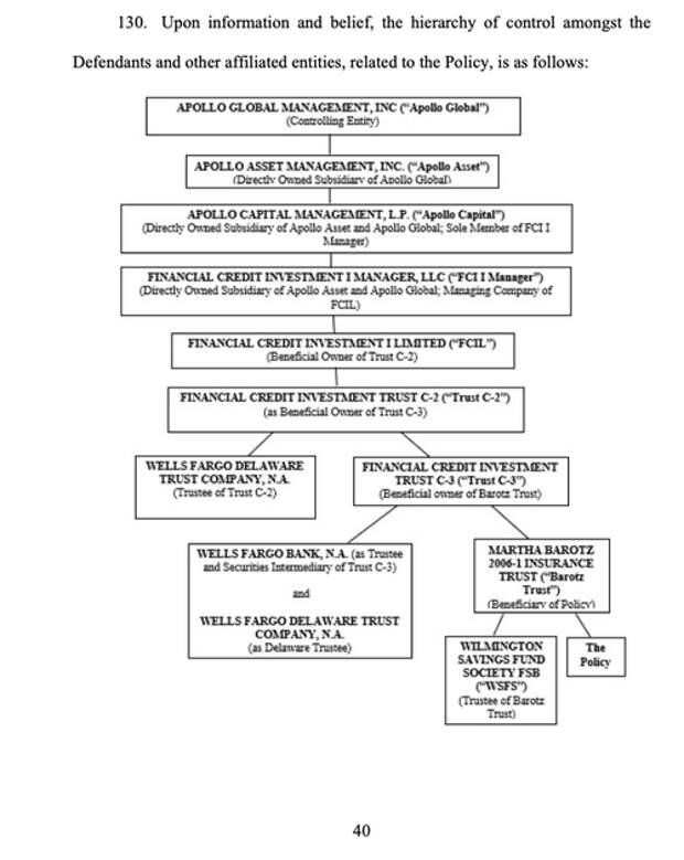 This scheme was designed to give the policies the illusion of legitimacy. Martha Barotz's estate initiated the legal action filed in Delaware's Chancery Court last Friday. It raises serious questions about Apollo's ethical practices.