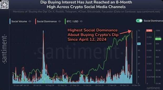 “With Bitcoin falling as low as $95.5K today, the ratio of crypto discussions that are about buying crypto’s dip has reached its highest level in over 8 months,” crypto analysis firm Santiment said in a Dec. 19 X post.