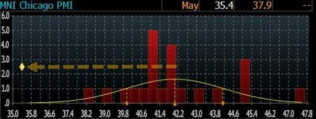 After unexpectedly slumping last month to 37.9, the Chicago PMI index cratered even more unexpectedly in May, when it defied hopes of a rebound to 41.5, and instead tumbled even more, sliding to a cycle low of 35.4 which was not only below the lowest estimate, but was staggeringly low.