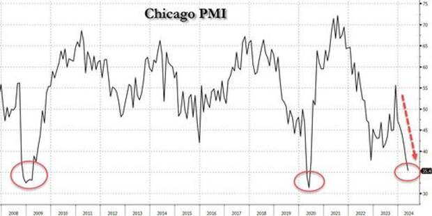 To get a sense of just how low, the last two times it printed here was during the peak of the covid and global financial crises...... which seems to suggest that at least according to Chicago-based purchasing managers, the economy is in a depression.