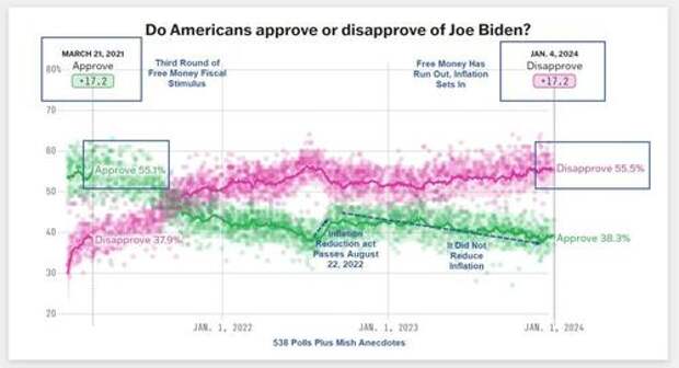 The third and largest round of fiscal stimulus was in March of 2021. That’s when Biden’s popularity peaked at 55.1 percent.