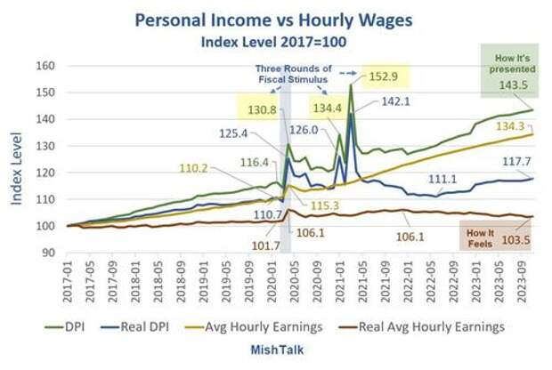 Personal income data from the BEA, hourly wages from the BLS, real hourly earnings and chart by Mish.